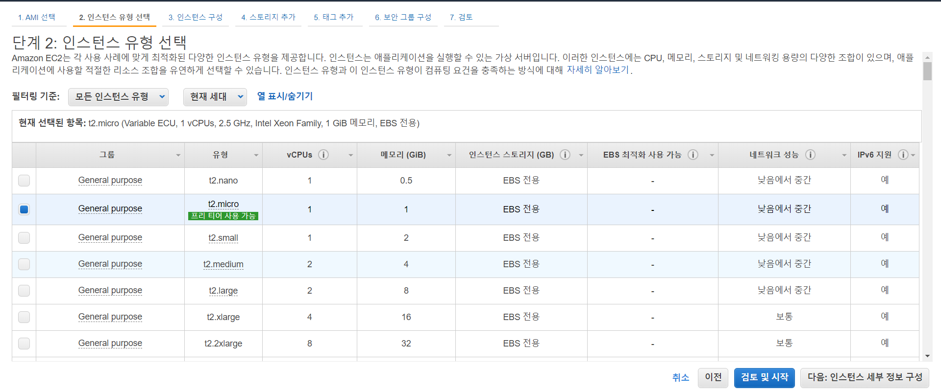 - 공짜로 배포를 할수 있는 프리 티어를 이용할 것이기 때문에, 프리티어 사용가능한 두번째 칸을 선택하고