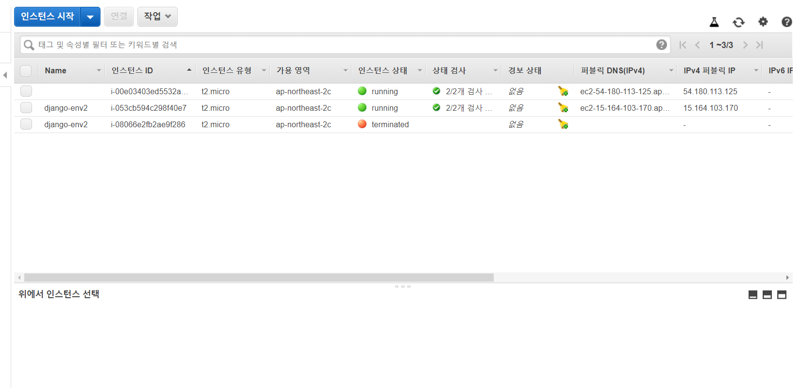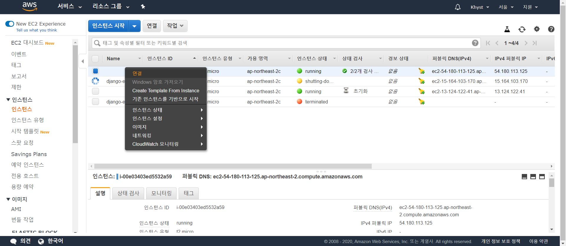 (현재 3개의 목록은 각각 장고 프로젝트의 배포를 위해 Amazon 서버에서 돌아가기 위해서 만들어진 EC2 Instance이다.)