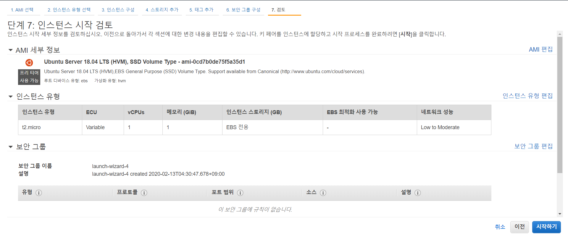 필자의 컴퓨터 상으로는, 시간상으로 2020-02-13 04:31:19가 제일 빠르므로, launch-wizard-4가 방금 생성된 보안그룹임을 알 수 있다.