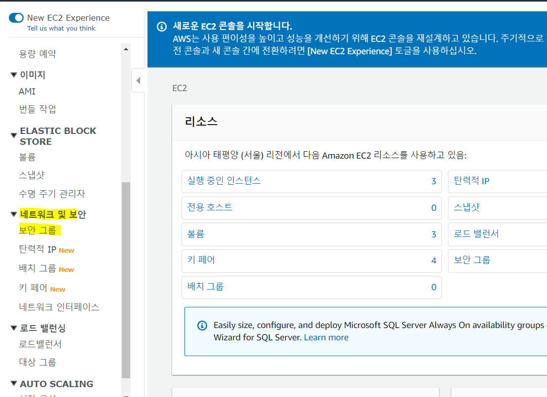 - EC2로 돌아와서 좌측메뉴에서 네트워크및 보안 > 보안그룹으로 들어가자
